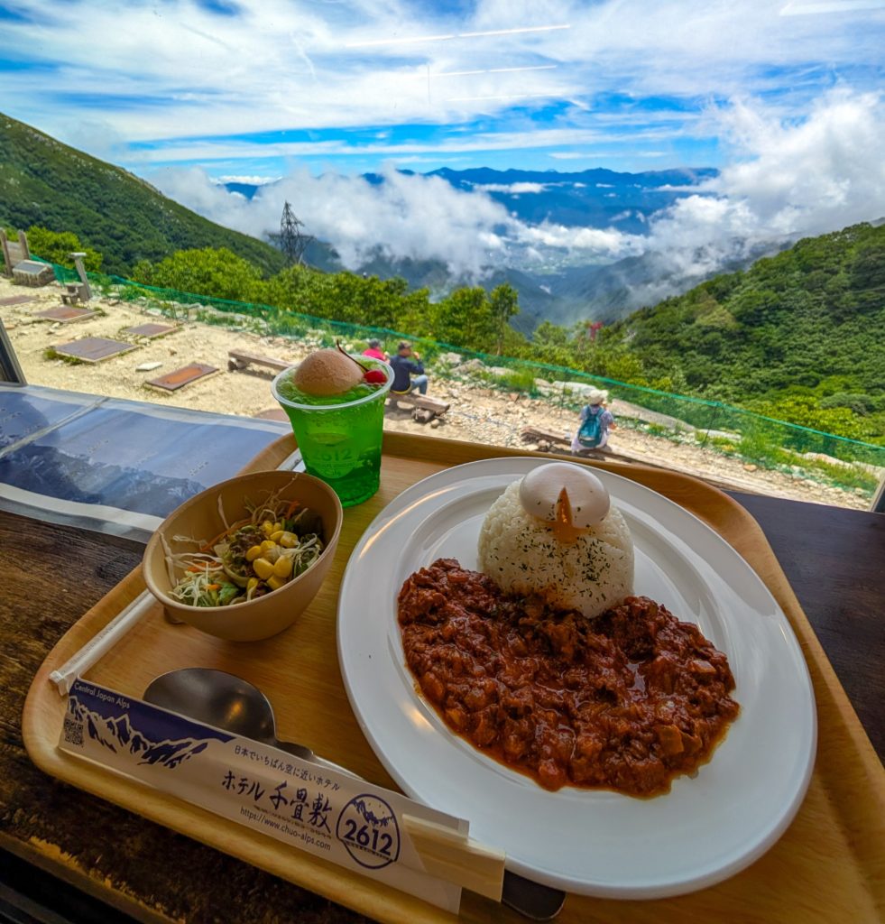 11:10 ロープウェイ乗り場まで戻ってきました。 ロープウェイ乗り場にはホテルやレストラン、売店が併設されています。せっかくなので山グルメを注文。スパイスの効いたカレーと冷たいクリームソーダを絶景を眺めながらいただきました。